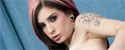Dyed hair. Lots of tattoos. Goth/Punk appearance. Petite. 34 cup breasts.
